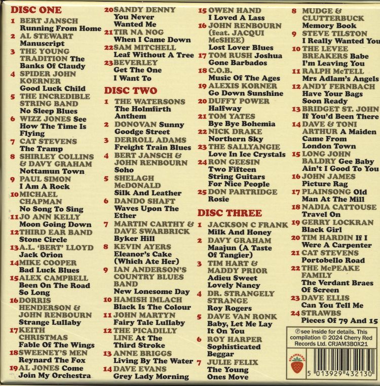 Di questo demi-monde antico e sotterraneo e dei suoi eroi raccontano i 3 Cd di Les Cousins e le ricchissime note del libretto redatte da Ian A. Anderson, quasi omonimo del leader dei Jethro Tull, editore/direttore della rivista fRoots (Folk Roots) e a sua volta cantautore folk di belle speranze che lì si esibì intrecciando stretti rapporti con gli altri accoliti. Nel compilare la scaletta di 71 pezzi tutti già editi ma in alcuni casi di difficile reperibilità, non poteva che cominciare dall’artista simbolo del locale, quasi una mascotte che ne accompagnò l’intera e breve esistenza: lo scozzese Bert Jansch, «il Jimi Hendrix della chitarra acustica» (parola di Neil Young) che con l’amico John Renbourn avrebbe creato un sodalizio storico da cui sarebbero nati i Pentangle (qui li si ascolta anche insieme in un brano non casualmente intitolato proprio Soho).
