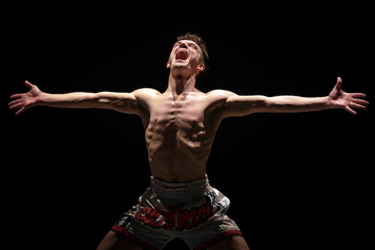 Tagliavini si è presentato in scena a torso nudo, calzoncini da boxeur e calzettoni bianchi bordati da un pizzo in stile Louis XIV. In una wunderkammer satura di gestualità e di danze, dentro un ring immaginario ha avuto inizio una sfida e una lotta con un avversario invisibile. Stupore e ironia, nei riguardi della danza classica, si sono interfacciati con il corpo e con le parole scandite ossessivamente in inglese, in  francese, in italiano. Noi spettatori, attraverso l’energia di Tagliavini, ci siamo immersi in un contorto sfinimento alla faticosa ricerca dell’equilibrio, fra squilli di trombe rossiniane e melodie morriconiane.