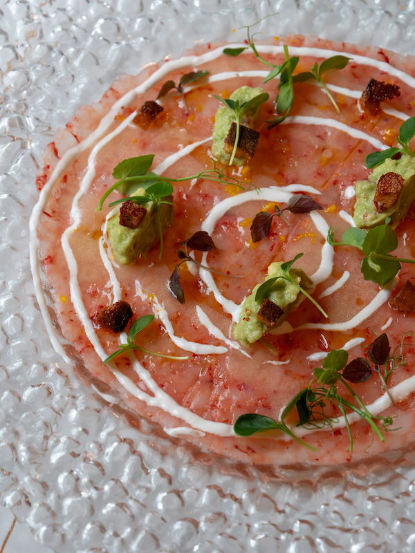 Il menù si muove fra crudi, piatti di pesce, carne e proposte vegetali, in un equilibrio che alterna riconoscibilità e sorpresa. Fra le proposte spiccano il Velo (battuta di gambero viola accompagnata da guacamole, salsa agli agrumi, burrata e crostini alla paprica) e la Tartare di scottona condita con fiori di cappero, cetriolini, senape, lamelle di tartufo, femore arrosto e maionese al finocchietto.