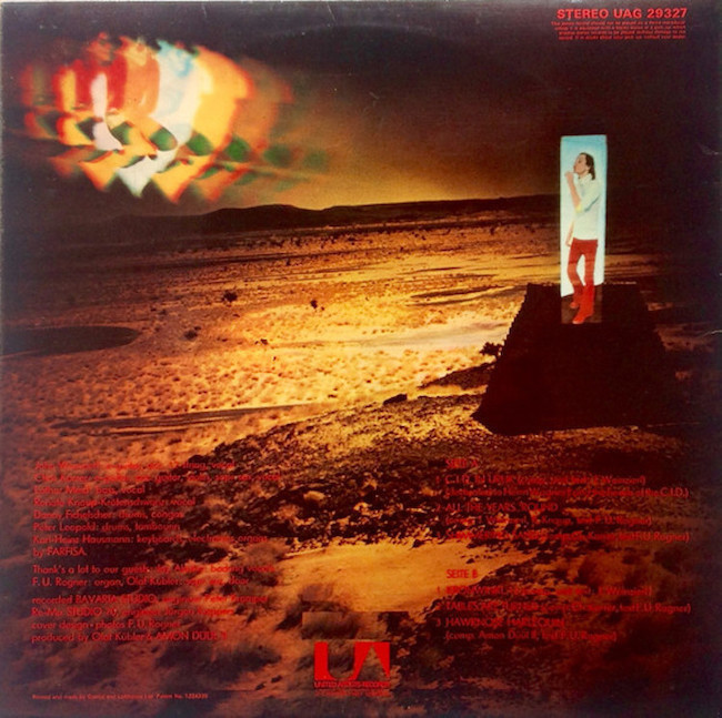 Succedeva di continuo, sulle 2 brevi facciate di un album che si apriva con il motivo orientaleggiante di C.I.D. In Uruk, l’unico brano cantato in tedesco, aperto da suoni che rammentavano i gamelan indonesiani e in cui il fraseggio chitarristico spagnoleggiante di Weinzierl, autore del pezzo, sembrava ispirarsi esplicitamente allo stile di John Cipollina in Happy Trails; subito dopo All The Years ‘Round alternava strofe trasognate a incisi impetuosi prima di sfociare in un serrato epilogo (assente nella versione “edit ” tagliata di oltre 3 minuti e pubblicata come 45 giri), con 2 acide chitarre che si attorcigliavano intorno a un riff arabeggiante mentre sul 2° lato, in Kronwinkl 12, le voci in stile Airplane si appoggiavano su accordi e su un beat quasi funk.