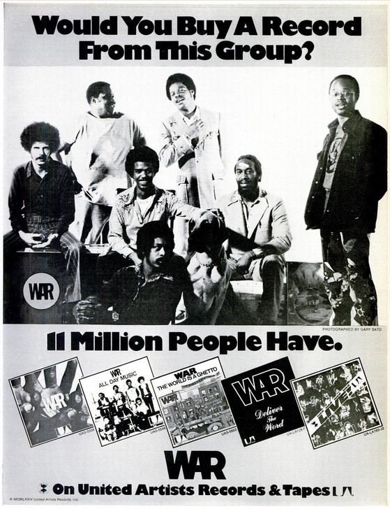 Sono i primi anni 70, gli Usa sono ancora impantanati in Vietnam, a casa divampano i conflitti razziali e “peace & music ” di Woodstock è già un lontano ricordo. Per questo Papa Dee Allen, Harold Brown, B.B. Dickerson, Lonnie Jordan, Charles Miller, Howard Scott e Lee Oskar, 6 afroamericani e 1 danese bianco emigrato in California, si fanno chiamare War.